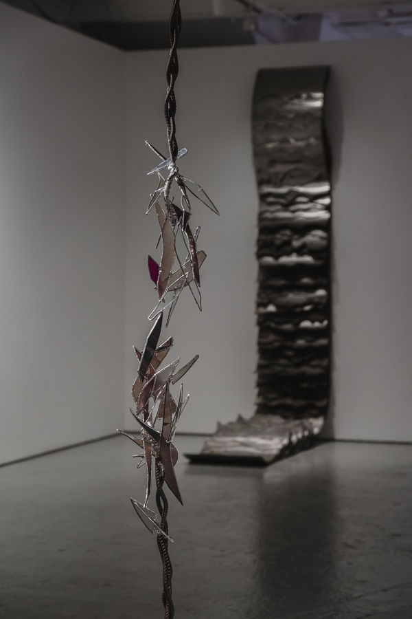 the soft disorder, 2024uv print on glass, solder, copper, stainless steel, varnish18" x 35" x 2" -